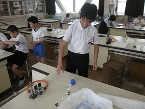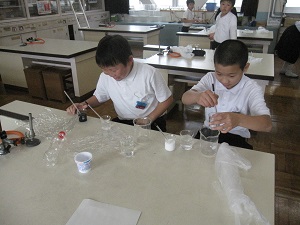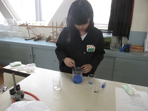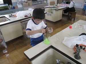 理科クラブではスライム作りをしました。PVAの洗剤のりに、絵の具の色水を加え、ホウ砂水溶液を少しずつ混ぜていきます。いろんな色のスライムができました。