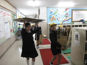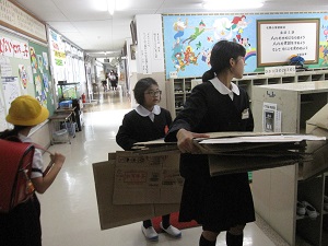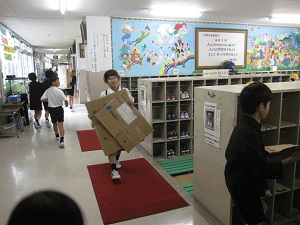 明後日の資源回収に向けて、5・6年生が段ボールを玄関まで運んでくれました。