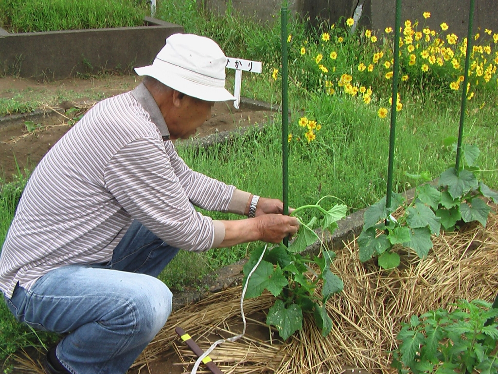 その他にも、他の学年の植えたトマトやキュウリの蔓を支柱に紐で結び、この後のお世話のポイントも教えてくださいました。