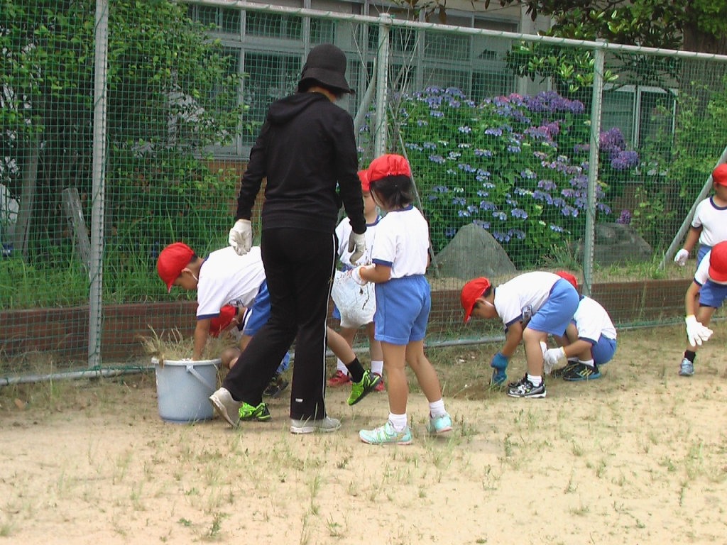 全学年で、運動場・中庭・前庭・学級園など学年担当の場所に行き、草むしりや石拾いをしました。
