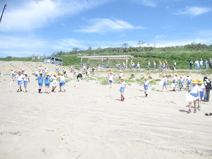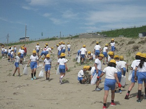 4年生が調べ学習をしていたかほく市の海の環境学習の一環として全校児童と地域のボランティアの方,海上保安庁の方で海浜クリーン作戦を行いました。