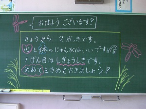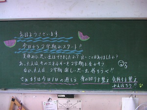 各教室の黒板に、新学期子ども達を迎える担任からのメッセージが書かれています。