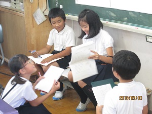 一人一人が自分の好きな理由をノートに書いた後、同じ詩を選んだ友だちと交流。その和気あいあいさに、3度目のびっくり。