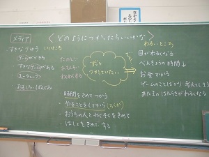 子どもたちは自分の生活の中からメディアのいいところと悪いところを考え、どんな使い方をすればいいのかをみんなで知恵を絞って考えました。
