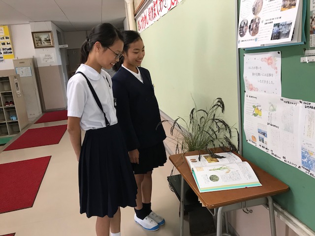 児童玄関に飾り、古代米の事がわかる本を横に置いてあります。