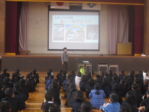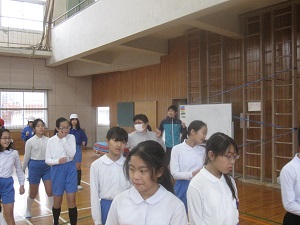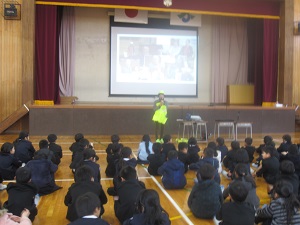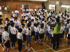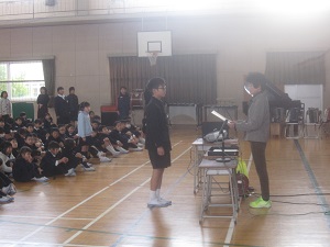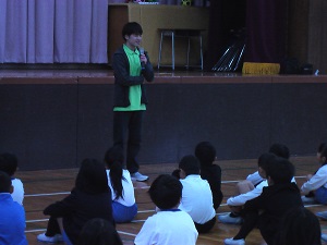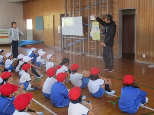 体育館に全員集まり、げんきっず体操をして1日を元気にスタートさせました。11月から毎週水曜日に学習ボランティアとしてきてくれていた高橋先生が、本日でお別れです。勉強を教えてもらったり遊んでもらったりしました。ありがとうございました。