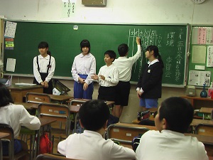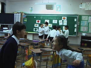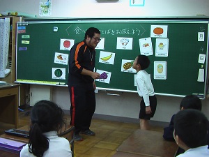 この日は、2年生が食べ物の言葉を覚えていました。先生や友だちと、ゲームを通して楽しく学び合っていますね。