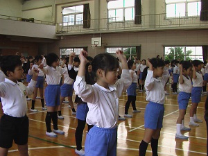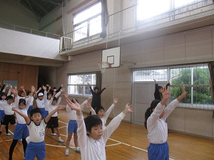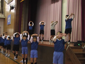 今日は月に1度の全校全員でのげんきっずデーでした。PTA会長さんも学校にやってきて一緒に体操を行いました。