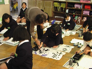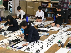 田丸先生・徳應先生・三好先生の3人の書家をお迎えして、書き初め練習を行いました。1日目は、4年生と6年生です。それぞれの学年の課題のポイントや筆遣いを習いながら、みんな真剣に書いていました。