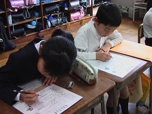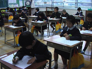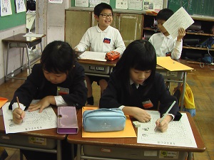 昨日に引き続き、今日は3年生と5年生が書き初め練習に挑みました。