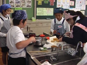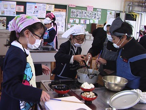 自分たちで考えた味噌汁を、どのグループも協力して楽しそうに作っていました。