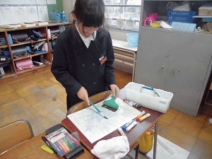 1年2組の子ども達が、図工室で絵の具を使って絵を描いていました。