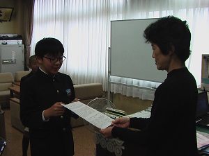 5年生が、国語科の「明日を作る私たち」の学習で作成した提案書を、校長に提出しました。身の回りの問題を9つのグループで話し合い、理由を添えて提案してくれました。楽しい学校にするために、環境をよくするために…と、どのグループも高学年らしい視点で考えてくれていました。回答は、3学期にと約束して受け取りました。冬休みにじっくりと読ませてもらいます。