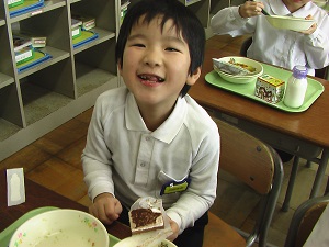 この日のデザートは、クリスマスケーキ。小さなチョコケーキを、とっても美味しそうに味わっていました。子ども達の笑顔に、思わずこちらも笑みがこぼれます。