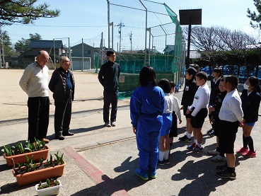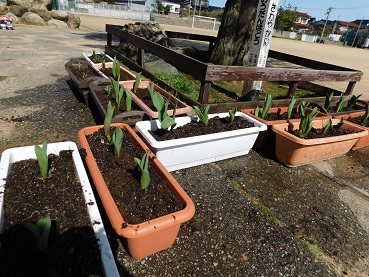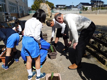 3月18日(月)昼休みに環境委員会の4・5年生が、遠塚老人クラブの塩本さんと山本さんにお手伝いいただいて、チューリップの苗をプランターに植えました。