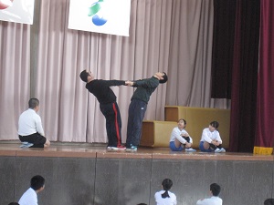 恒例になった、先生たちが提案した運動をみんなで真似し、朝から元気いっぱいに運動しました。