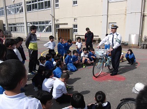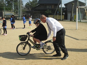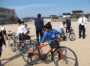 津幡警察署と市防災環境対策課の職員の方々をお迎えして、3年生の自転車教室を行いました。来年度5月に行われる自転車交通安全教室を前に、全員がまず自転車に乗れるようにと指導していただきました。ご指導のおかげで、安全に気をつけて自転車に乗ることができました。ありがとうございました。