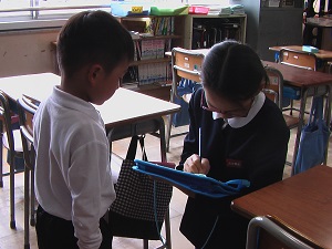 休み時間を利用して、自己紹介をしています。自己紹介した相手からはサインをもらうのですが、6年生のお兄さん・お姉さん達も、とっても嬉しそうにサインしていました。