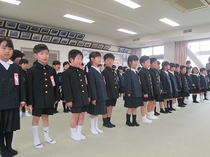 入学した1年生をお祝いする「1年生おめでとう集会」を開きました。主催したのは、2年生。まずは、温かい拍手で1年生を迎え、校歌を歌ってお祝いしました。