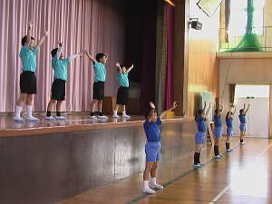 本番での美しい演技をめざして、4年生ががんばっています。練習の始まりと終わりを5人の実行委員で行っているのも、主体的な姿につながっています。