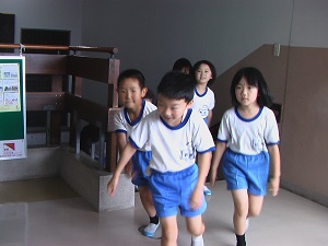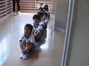 緊急地震速報の音楽が聞こえると、子ども達は何も言わずにさっと机の下にもぐり、頭を守りました。