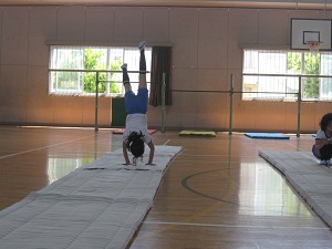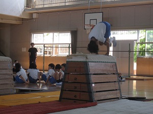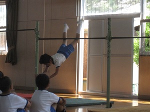 跳び箱からはじまり、マット、鉄棒と演技が進みます。七塚小の息の合った演技や、マットのすごい技を褒めてもらえました。器械運動交歓会を大成功で終えることができ、子ども達も満足そうにしていました。