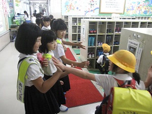 3年2組では話し合いをして、たくさんの人にハイタッチをしようという目標を立てました。ハイタッチしながらあいさつをするとみんながにっこり笑います。