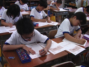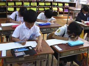 2~6年生で、年2回QUテストを行っています。QUは、「やる気のあるクラスをつくるためのアンケート」「いごこちのよいクラスにするためのアンケート」「ふだん(日常)の行動をふり返るアンケート」の3つの心理テストから構成されています。子ども達が、安心してクラスで学習できているか調査し、子ども達への的確な支援や教師の指導改善につなげています。テストの結果は、本人を通して保護者の方にも伝えます。