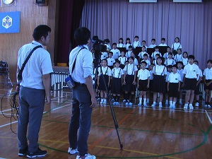19日(水)河北台中講堂で行われる令和元年度第1回市音楽会に出場するため、今5年生はがんばっています。その様子を、13日(木)6限目に、市のケーブルテレビが取材に来ました。初めての体育館練習だったので緊張しながらも、みんなで歌声や演奏を響かせました。