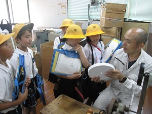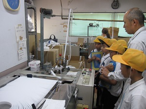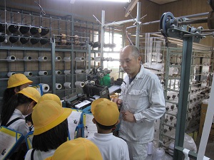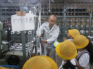 折戸製紐工場の見学では,ひもとゴムを機械で何度も織り、丈夫な紐を作るようすを見学させてもらいました。出荷される紐が劣化しないように加工されている様子を見学でき、児童にとって貴重な体験になったようです。