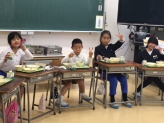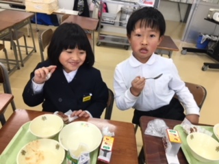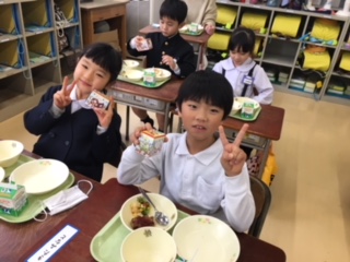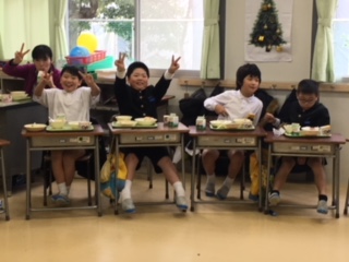 2学期そして2019年最後の給食は、クリスマスメニュー。もみの木ハンバーグにクリスマスソテー、そしてデザートにはクリスマスケーキまで。どのクラスも、クリスマスソングを聴きながら、楽しくいただきました!