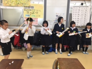 職員室前の2年教室から楽しい音楽が…のぞいてみると、図画工作で作成したギターを持ち、かっこよくみんなで弾いていました。今月の歌や校歌など、音楽に合わせてノリノリに演奏して、とっても楽しそうでした。