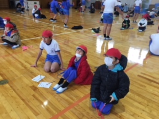 げんきっず体操のあとは,頭も使う運動を行いました。簡単な動きのはずが、左右の動きを変えると上手くいきません。休み時間に友達と練習してみるのもよいですね。