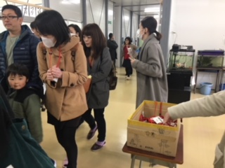 その後の引き渡し訓練では、保護者とともに避難。たくさんの人数でしたが、玄関で計時し、時間を伝えながら緊張感を持って速やかに避難することができました。