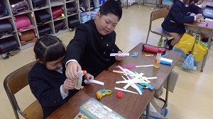3年生が理科の時間で学んだことをいかしておもちゃ作りをしました。そして、それを2年生と6年生に楽しんでもらう発表会を行いました。たくさんのお客さんが集まりました。