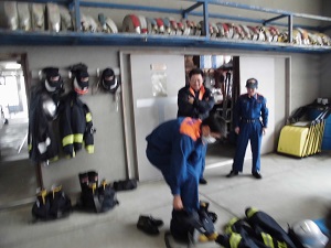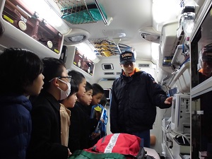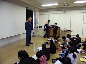 火事から生活を守るためにどんなお仕事をしているのかお話を聞いたり、実物に触れたりしながら学びました。見学の途中で救急車が出動し、あっという間に出動していく場面がありました。消防署ではたらく人たちが火事だけでなく、病気や怪我などからも私たちの生活を守っていることに気付けたようです。