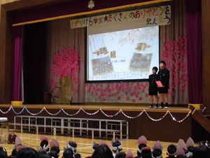 生活目標の提案では、2年生が、「いつでも・どこでも・誰にでも」挨拶できるよう、全校児童に呼びかけました。