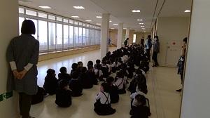 地震がやんでから、津波への警戒のため、3階へ移動する際も、しゃべらずに素早く行動できていました。避難にかかった時間は2分14秒と、なかなかの記録でした。日頃から、防災意識を高めていければ、いざというときに自分の命を守れますね。