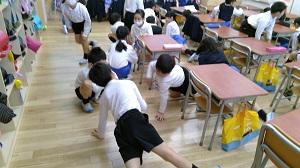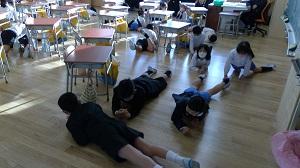 地震の放送の直後、児童は素早く机の下にもぐり、頭を守っていました。