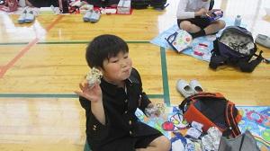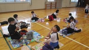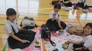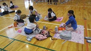今日は1・2年生の遠足の予定でしたが、あいにくの雨のため、予定を変更することになりました。体育館で友達とお弁当を食べました。いつもとは違うメンバーで美味しいお弁当を食べられたのが嬉しかったようです。