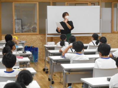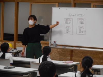 フリーアナウンサーの松田さんを講師としてお招きして、1年、3年、5年の子どもたちが美しい日本語について学びました。おしゃべリモコンを使って、相手に伝わる話し方「相手の反応を見ながら声の速さや大きさに気をつけて」話すことを習いました。また、話す練習をすることが大切なことやプラス言葉をたくさん使うと幸せを呼び込むことにつながること等を教えていただきました。明日からの学校生活に生かしていくことができたらうれしいです。