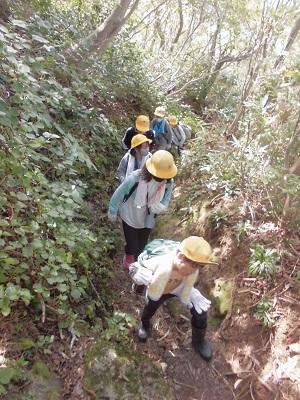 とても急な斜面、むき出しになっている木の根、出っ張っている岩などがある足場の悪い中、