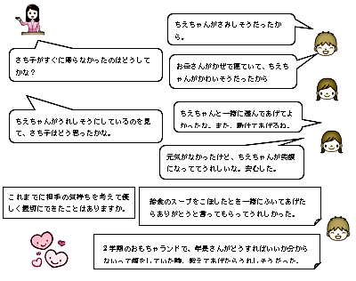 相手のことを考えて、行動できる人がいると、周りの人の気持ちも温かくなります。みんなが楽しく学校ですごすためにも、周りの人に親切にできるようになるとよいですね。