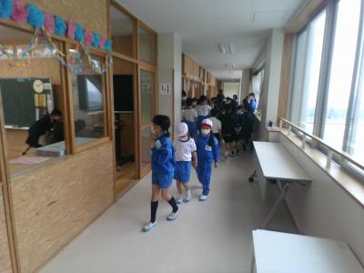 5年生が1年生を迎えに1年教室に行き、自分の教室へ連れて行きました。