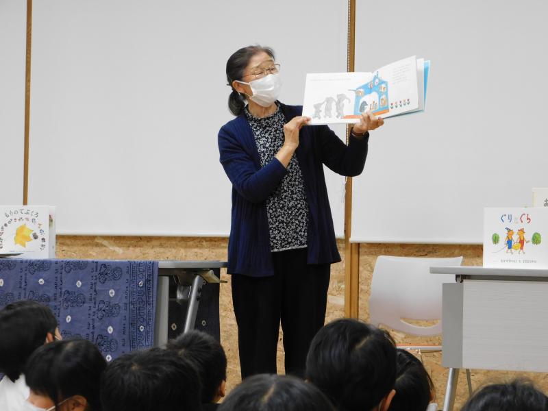 今回は、国語単元本の紹介もあり、国語単元「くじらぐも」の作者、なかがわりえこさんの本「ぐりとぐら」のシリーズ、「そらいろのたね」の読み聞かせなどもしていただきました。特に「森のおばけ」には教科書の"くじらぐも”も出てくると聞き、子どもたちも興味津々でした。