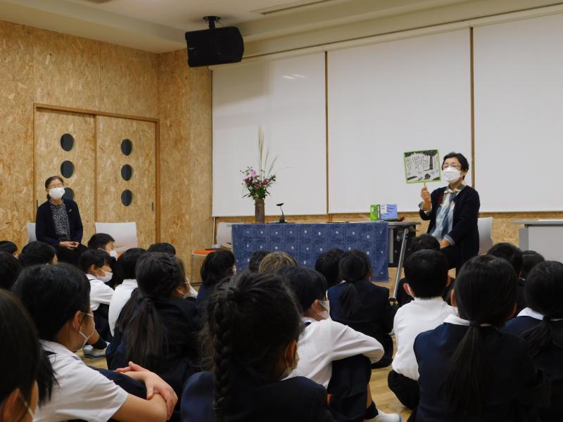 2限目に、やまんばお話しの会の細川さん・山名田さんに来ていただいて、1年生向けのお話会がありました。