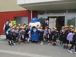 安全見守り活動の一環として、津幡警察署と地域の防犯協会の委員の皆さんが子ども達のために学校に来て、防犯の呼びかけをしてくださいました。そして、津幡署のマスコットキャラクターである「白鳥係長さん」も一緒に防犯のPRをしてくれました。子ども達は、予告なしのかわいい来客に大喜びでした。不審者から子ども達を守ってくださっている津幡署や防犯協会の皆様、これからもよろしくお願いいたします。