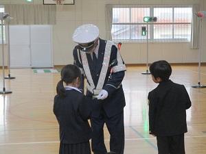 26日、1年生は交通安全教室を実施しました。本来ならPTAの方々にもご協力いただき、学校の周りの道路を歩きながら実施する予定でしたが、あいにくの雨天で、体育館での実施となりました。お忙しい中、警察署の方々や市役所、交通推進隊、見守りボランティアの皆さんに来ていただき、危険な箇所での「止まる・見る・待つ」方法について、本当に丁寧にご指導いただきました。1年生の皆さん、今日学んだことを忘れずに、くれぐれも安全に登下校してくださいね。