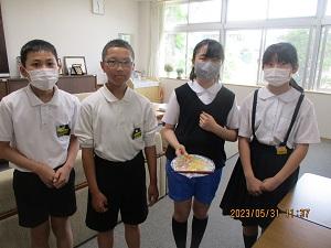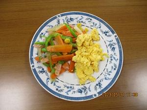 6年生の家庭科では、「いためる」という調理法を学ぶ学習の一環として、朝食のメニューを考え調理するという実習があります。今日は6の1のみんなが、彩りいためトスクランブルエッグを作って校長室に持ってきてくれました。赤・黄・緑の色どりがとてもきれいで、味も炒め具合もばっちりでした。これを機会に、ぜひお家でも朝食づくりなどにチャレンジししてくださいね。ごちそうさまでした