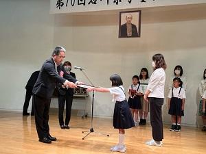今日は、かほく市出身で世界的な哲学者である西田幾多郎博士の忌日「寸心忌」の献花式がありました。そして寸心忌には西田幾多郎博士頌徳記念として「石川県学童話し方大会」が西田幾多郎記念哲学館で行われています。今年で70回を迎える大会に本校の3年代表児童も「はじまりは『しずかなよる』」と題して参加し、見事優秀賞を受賞しました。